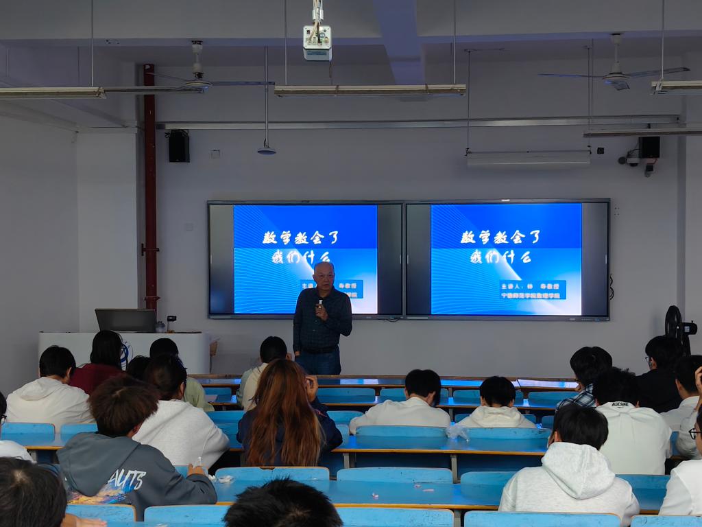 为深化大学生对数学学科价值的认知,筑牢专业学习基础,10月21日下午,数学研究所所长林寿教授在CB301开设《数学教会了我们什么》专题讲座。2024级数学与应用数学专业学生聆听了本次讲座。