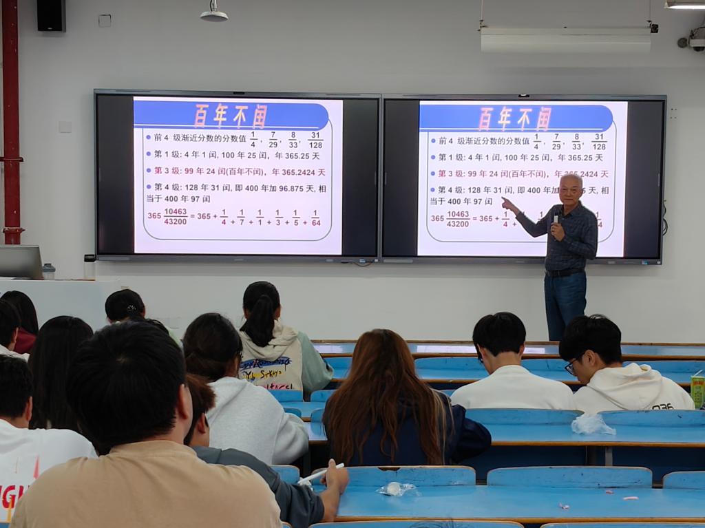 林寿以“学科本质+经典案例”方式,从《天文学大成》《天球运行论》等经典著作切入,结合开普勒定律的数理逻辑、“百年不闰”历法规则的连分数计算等实例,解析数学在天文学、生活实践中的底层支撑作用;以欧拉、伽罗瓦等数学家的研究历程为引,阐释数学思维中逻辑推理、抽象建模的核心能力以及严谨求实的学科精神,通过生动的语言让原本抽象的数学知识变得通俗易懂。互动环节,他鼓励同学们积极发言,在解疑答惑中寄予殷切的期望。